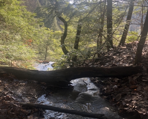 As you enter the gorge area you are transported into another world. Lush green moss and ferns greet you and draw you in deeper to the earthy smells of Conkles Hollow, but don’t be drawn to far into the gorge area because the Rim Trailhead is to the right, after you cross the wooden bridge.